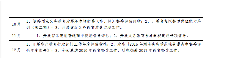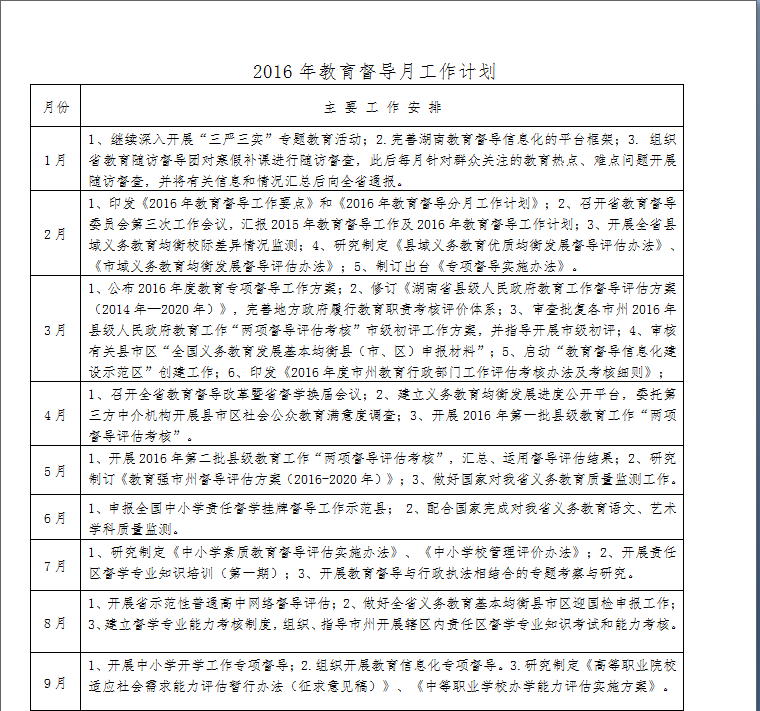 6.根据省政府办公厅《关于开展教育强市州、强县市区督导评估的通知》,制定《教育强市州督导评估方案(2016-2020年)》,启动教育强市州创建工作年度督导评估。通过对市州各级各类教育的全面督导评估,适时认定一批“教育强市州”,加快我省教育强省的建设进程。