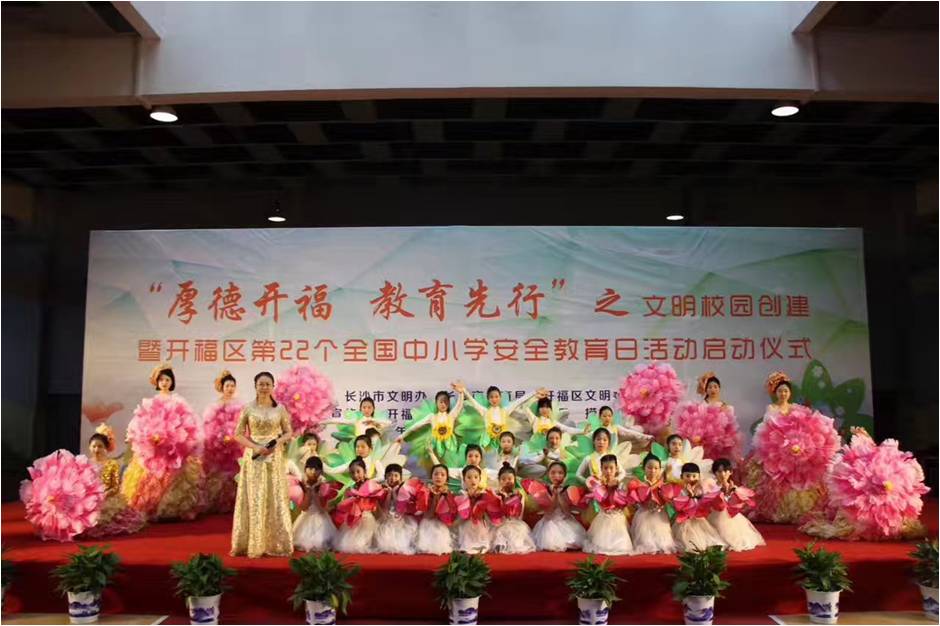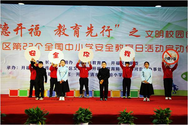 为进一步培育和践行社会主义核心价值观,进一步展示我区中小学“文明校园”创建成果,增强学生的安全意识,3月24日下午2点,“厚德开福 教育先行”之文明校园创建暨开福区第22个全国中小学安全教育日活动启动仪式在清水塘实验小学成功举行。长沙市文明办未成年人工作处处长朱治东、长沙市教育局文明办副主任杨世文、区委宣传部副部长、文明办主任罗海嵩、区政府主任督学毛建高、区教育局党委委员、副局长谭广林、捞刀河街道办事处主任出席了仪式,全区中小学、幼儿园安全分管领导也参加了此次活动。