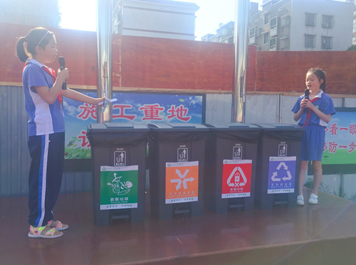 南塘小学利用国旗下讲话、广播站、宣传栏、宣传展板等阵地进行分类知识传播,校园里宣传氛围浓,分类垃圾桶设置规范。五1中队队员还通过编排的情景剧《垃圾分类,我们一起行动》在全校师生、家长面前进行表演倡议,号召大家积极行动起来。
