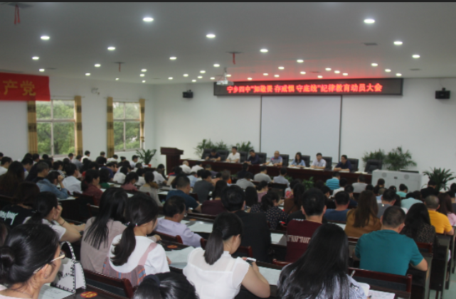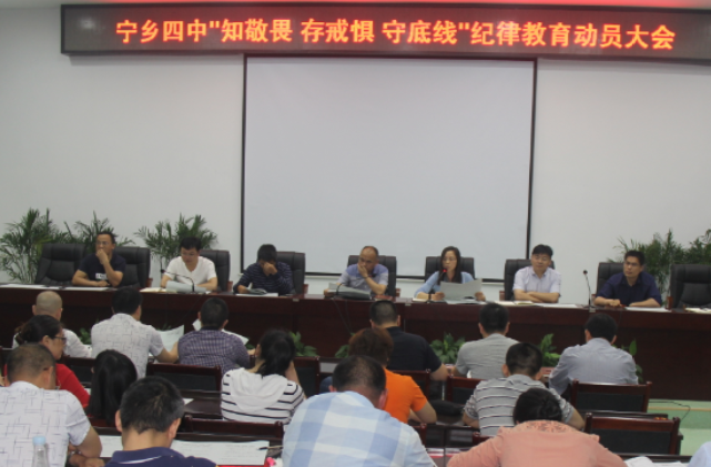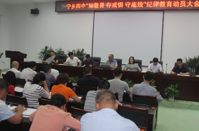 2018年7月4日,宁乡四中全体党员教师在学校综合楼五楼会议室召开“知敬畏、存戒惧、守底线”党员纪律教育大会,开展支部书记讲党课,全面部署“知敬畏、存戒惧、守底线”纪律教育第二阶段活动。大会由学校校长刘建军同志主持,黎卫华书记作了题为“挺纪在前讲政治,立足岗位抓教育”的重要讲话。