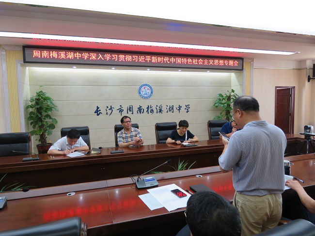 2位督学一进学校会议室,就真奔主题,问起了学校在落实防溺水工作、暑假教师培训学习安排、学生社会实践活动安排及情况、教师师德教育安排等假期前后工作情况。看到会议室电子屏上面的会标“周南梅溪湖中学深入学习贯彻习近平新时代中国特色社会主义思想专题会”,听着学校领导介绍是上周星期五刚刚学习过的会议内容,2位督学给予了高度评价。周军苏主任详细介绍了学校进行的防溺水工作,包括校宣系统正在播放的“防溺水专题”宣传课件,每个学生、家长都签订好了的“防溺水”告知书,7月2日全校升旗仪式上国旗下的讲话的“防溺水”专题宣讲活动,各个班级防溺水宣传等工作,将相关资料,尤其是活动照片给2位督学查看。暑假的培训,叶双秋校长重点介绍了学校的安排,将以“聚焦新高考、培养核心素养”为主题,3天的培训,已经邀请了湖南师大等4个专家,同时也安排学校领导、老师自己接地气的培训,并安排了半天的教师思想教育,学习习近平新时代中国特色社会主义理论等。学生社会实践活动,是周南梅溪湖中学一直坚持的一项工作,今年暑假学校除安排学生按照原有模式开展社会实践活动以后,还特别安排了面向全体学生的“青少年科学调查体验活动”,因为他们是今年的“全国青少年科学调查体验活动特色学校”,要求学生在9个方面开展活动,在网上参与学习、申报调查表和活动成果,这些工作已经及早在学校网站进行了布置,并由教科室主任秦有才在7月2日的升旗仪式上做了“周南梅溪湖中学全国科学调查体验活动启动仪式暨活动指导”的动员和指导,相信一定会取得很好的成绩。